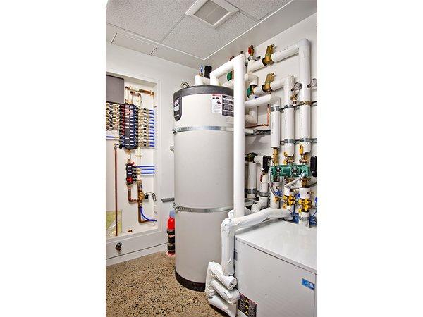 加州大學戴維斯分校的工程師們設計了院子里的地源熱泵系統(tǒng),通過相對穩(wěn)定的土地溫度給穿過房子的空氣降溫或加熱。這一系統(tǒng)還能對地板下方和二樓屋頂中水管里的水進行加熱或冷卻,以調節(jié)室內溫度。地源熱泵系統(tǒng)并非新技術,但這棟房子的系統(tǒng)使用了新設計以降低成本。